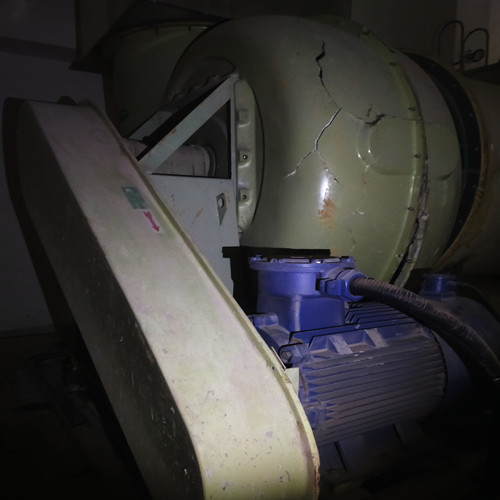 如下圖所示,玻璃鋼風(fēng)機(jī)的外殼以及內(nèi)部的葉輪都出現(xiàn)了嚴(yán)重的損壞,已經(jīng)無法修補(bǔ),只能換新。而導(dǎo)致風(fēng)機(jī)損壞的主要原因是操作失誤,一段金屬角鋼在焊接管道時(shí)掉落,從風(fēng)管內(nèi)部進(jìn)入了風(fēng)機(jī)中。在風(fēng)機(jī)葉輪高速旋轉(zhuǎn)的作用下,導(dǎo)致外殼破裂以及葉輪的葉片出現(xiàn)大面積損壞。